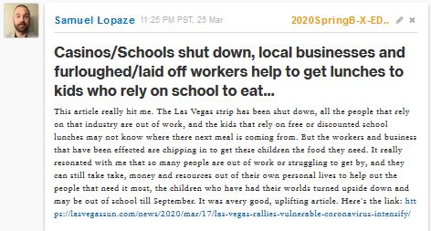 Through the engaging conversations I was able to have on YellowDig, the consensus I got from most of the partnerships discussed on the forum was that this pandemic we are currently embroiled in is going to make us come out of it as a stronger, more united country, if not world. On each page I put a screen shot of my Community Partnership post on the bottom of every page, with a reaction to the real-life partnerships that are happening today. I focused most of my articles on the COVID-19 pandemic currently going on because those are now and will be the most important partnerships for education going forward; education as we knew it has changed. When you click on the post it goes to the article I summarized and brought attention to, such as the one at right. It was a lot of fun talking to classmates on this platform as I was able to see what they saw as important in modern day educational initiative partnerships and we shared the same ideas for why they are important. I actually did about 4 or 5 posts extra so i could have a fresh partnership for every page of my website, so i had the pleasure of learning more about similar partnerships in different parts of the country.