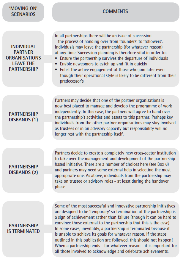 Transitions and endings are processes that occur in most partnerships; even most great partnerships come to and end. The important thing is knowing when the end is coming or already here. "Have an open and honest discussion with your partner(s) to understand when a coalition is transitioning into a stage of renewal or ending. Every partnership relationship is different. What motivates and engages each organization or individual to participate and to continue working collaboratively is different. Properly assessing your situation will help determine the best course of action. If people are bored or burned out ask, “Is the work of this group done? If not, then why are people feeling this way." (Strengthening, 2010). MANAGING THE TRANSITION OF THE PARTNERSHIP Others will be anxious that the partnership is not yet ready to move from talk to action. "As with all projects, considerable attention will need to be paid to working out the details and a clear Action Plan is important to give a framework and milestones that all can agree on. It may be useful at this stage to revisit the partnership’s management arrangements, common agenda , and work plans to adjust them if necessary." (Tennyson, 2011). |